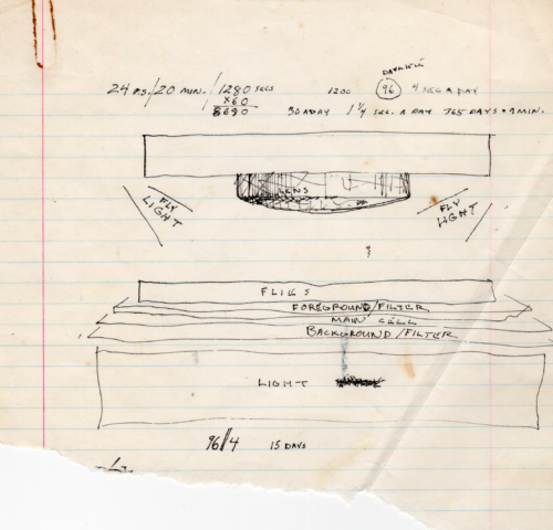In 1974, I was contacted by a wealthy man who knew my work and wanted to finance an animated film to be scripted and drawn by myself.. He wished for me to draw the film in black and white, which would have taken me a fearful amount of time, but he was just as enamored of my jump-scatter drawings as my line works, so the transition between the individual drawings would not require the same precision, and would actually enhance the style of the film as a whole. To make it even more kinetic I designed this “Fly Camera”, with a plexiglass case in which live flies would be shot over each drawing, or “cell” as animators call them. Naturally, at 24 cells to be photographed for each second of film, the flies would be in constant jump-motion over the already explosive artwork. Ultimately it was I who stepped away from the project, as I could not reconcile myself to creating that volume of drawings while cutting off all the other projects I was and would become involved in. Besides, animation was inimical to my approach to filmmaking.