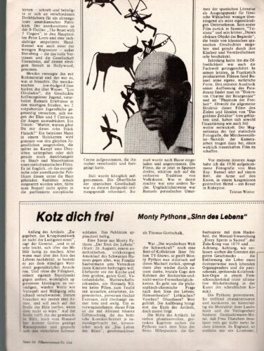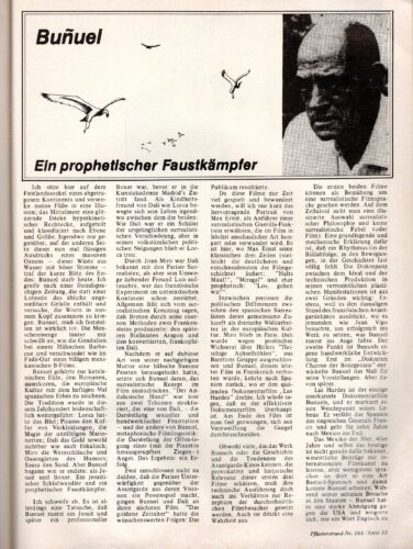 I was living in Italy -far south, outside of Napoli- when Buñuel died, so I was again summoned by Pflasterstrand to write the central article, which I managed to get through the Italian post in time to meet the deadline. Here is a scan of the full page and following half page they ran. As I was absent, somebody titled it A Visionary Boxer based on my final paragraph: “I see within me the famous 1930 photograph by Man Ray: Buñuel, sitting on a narrow bed, arms across his knees in a striped collarless shirt – posed like a boxer at rest.” They didn’t run the correct photo for my article, but instead used the kind of amateur graphics which, in those days, passed for avant garde in Germany. Somehow the translator also distorted my reference to his days with Dalí and Lorca to Buñuel “belonged to the Catalonian elite.” He was, of course, Aragonese.