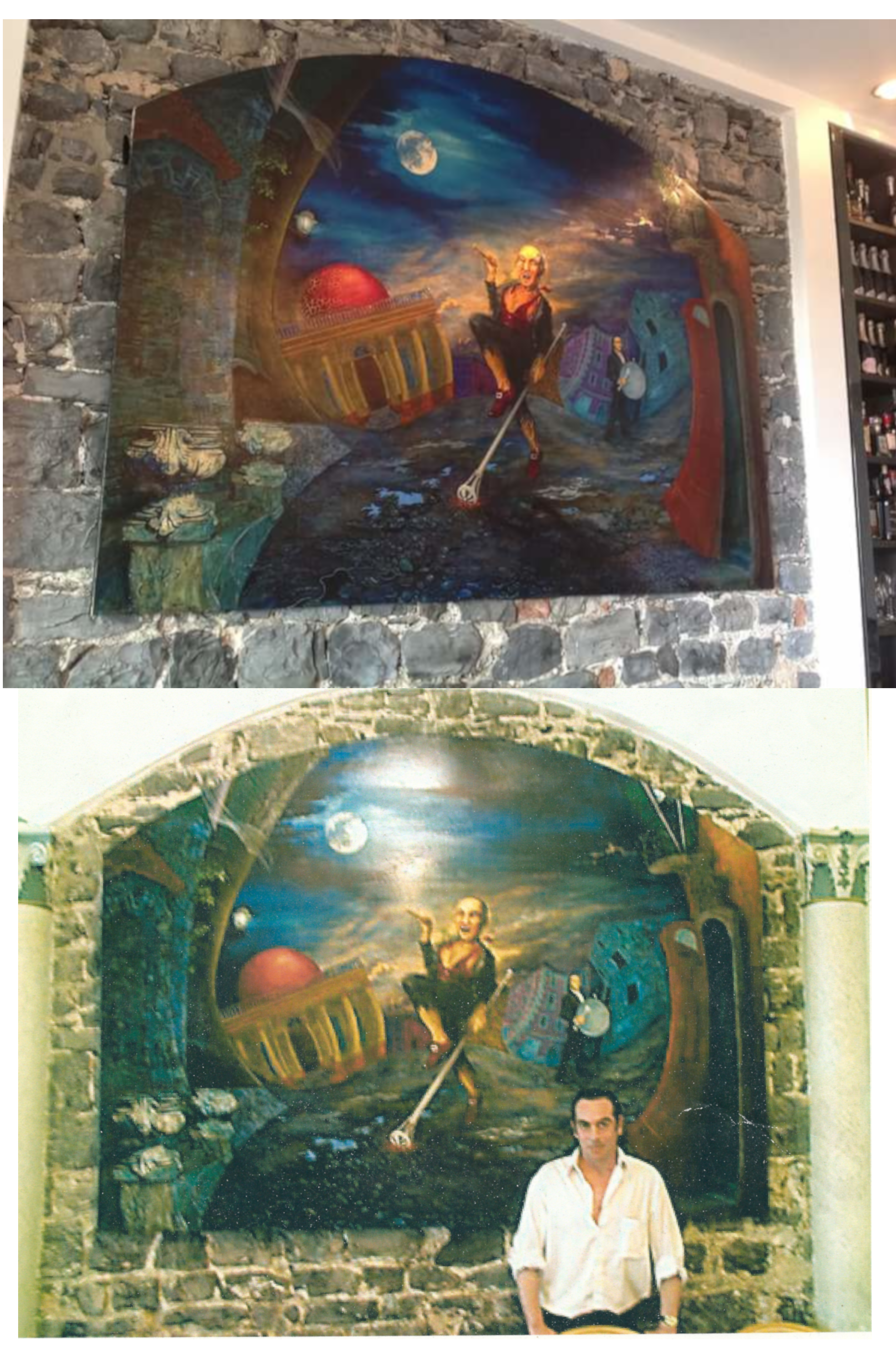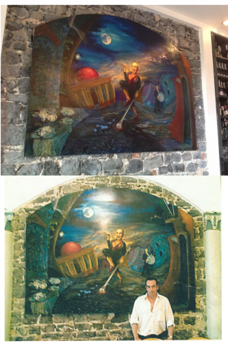 Bad photos of a mural (actually oil on custom built canvas) painted in Italy, 2002. Size can be judged by the artist, standing 3 feet in front of it.